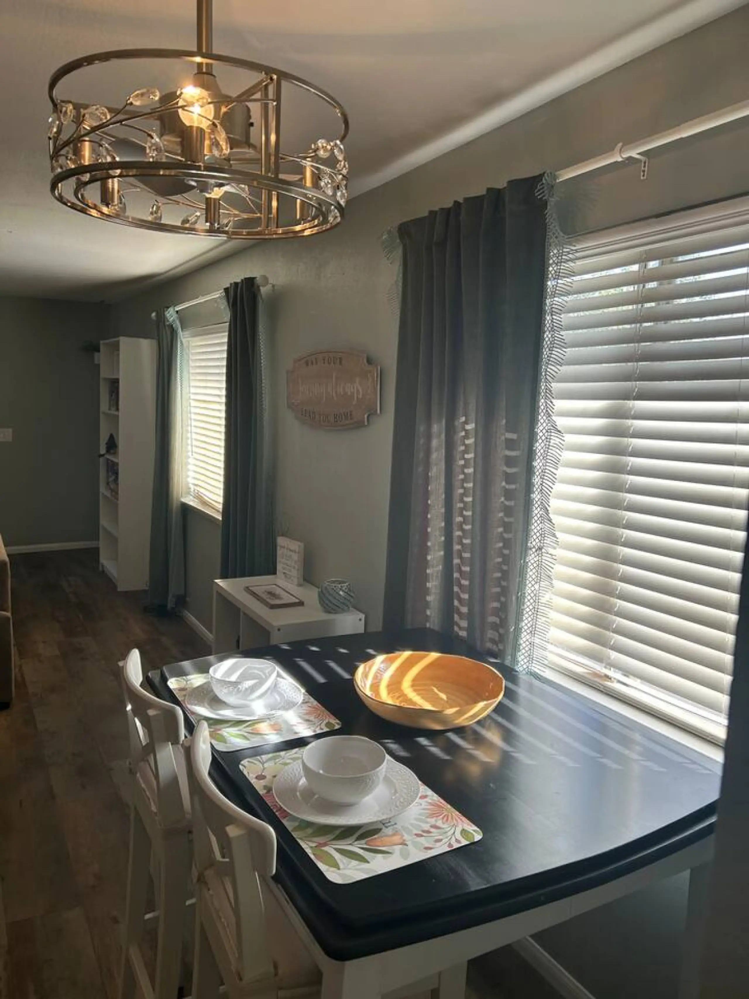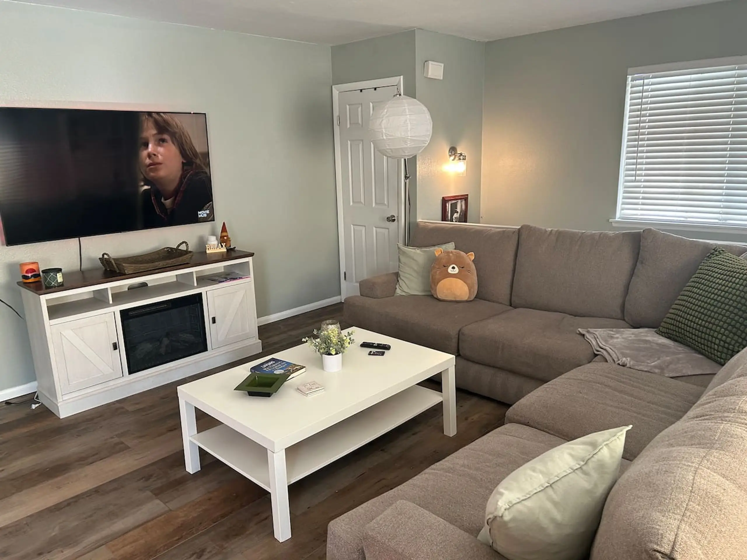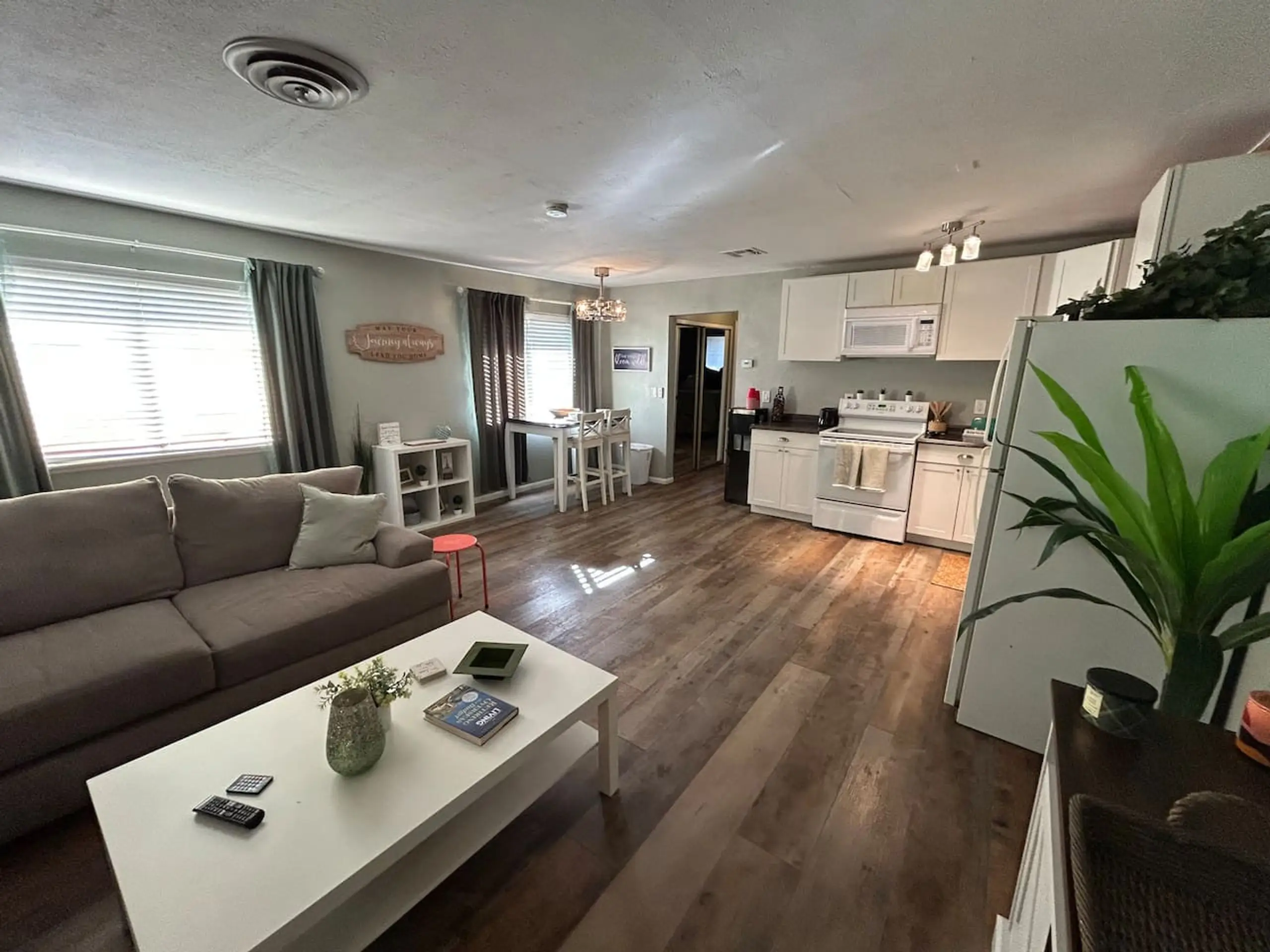 Fully furnished second-floor condo featuring one king bedroom, one bathroom, and one assigned carport in a central Las Vegas location near the airport, UNLV, and the Strip. The private indoor stair entry leads to a comfortable living area with wood-look flooring, oversized sofas, and a large TV. The kitchen comes fully equipped with dishes, pots, and pans, and includes a stackable washer and dryer.